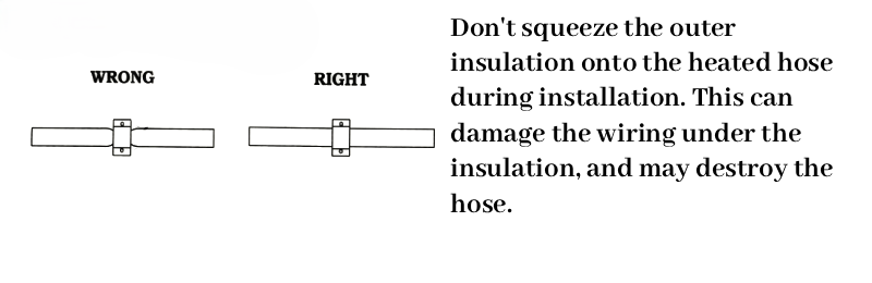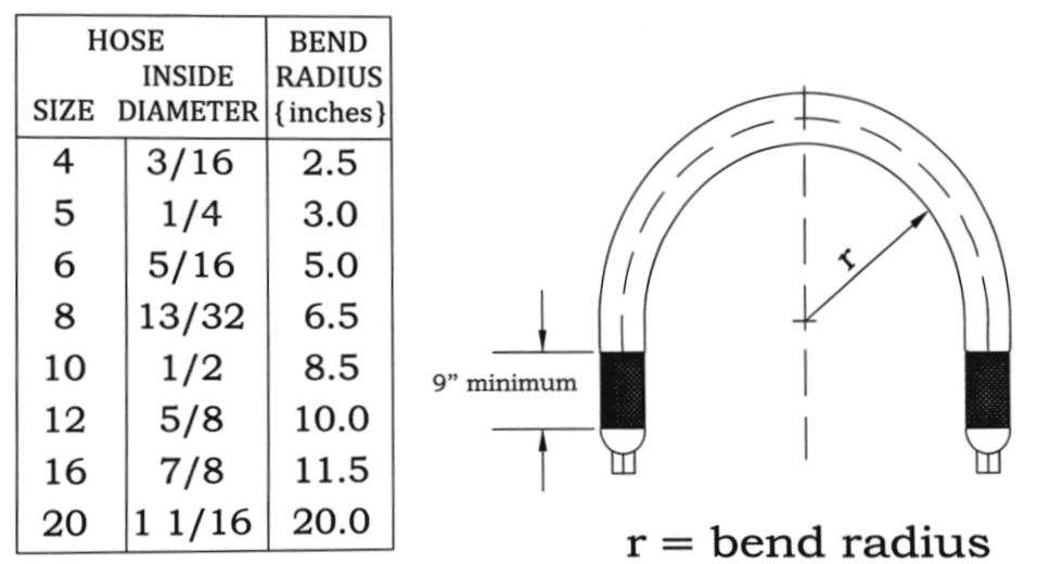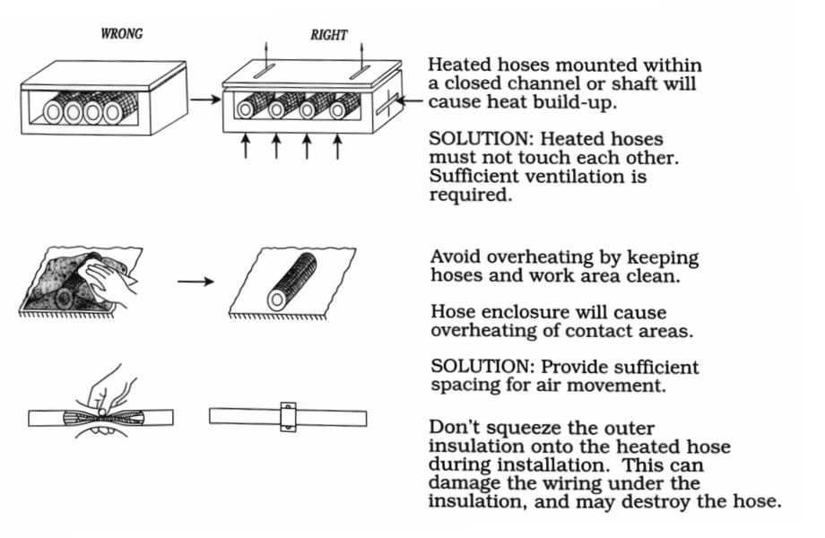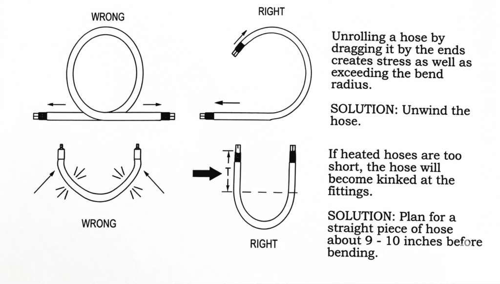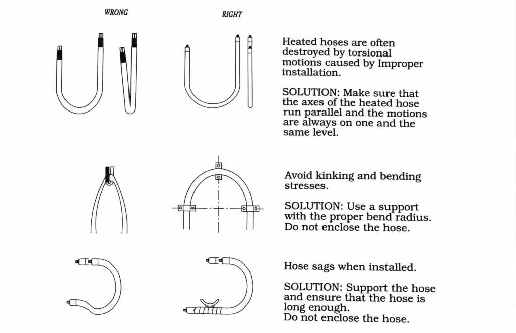 User Instructions Flexible heated hoses are designed to provide consistent temperature control for safe and efficient material transfer. Get In Touch i. General Instructions Do not apply any motion or bending stress directly to the hose fittings. Keep within the allowed bend radius (see il., below). Prior to disconnecting the hoses, depressurize the system completely. Always use two (2) wrenches when disconnecting hoses. Loosen slowly, wear protective clothing. ii. Allowable Bend Radius iii. Handling Instructions iv. Handling Instructions (Can't) v. Installation vi. Installation (Can't)